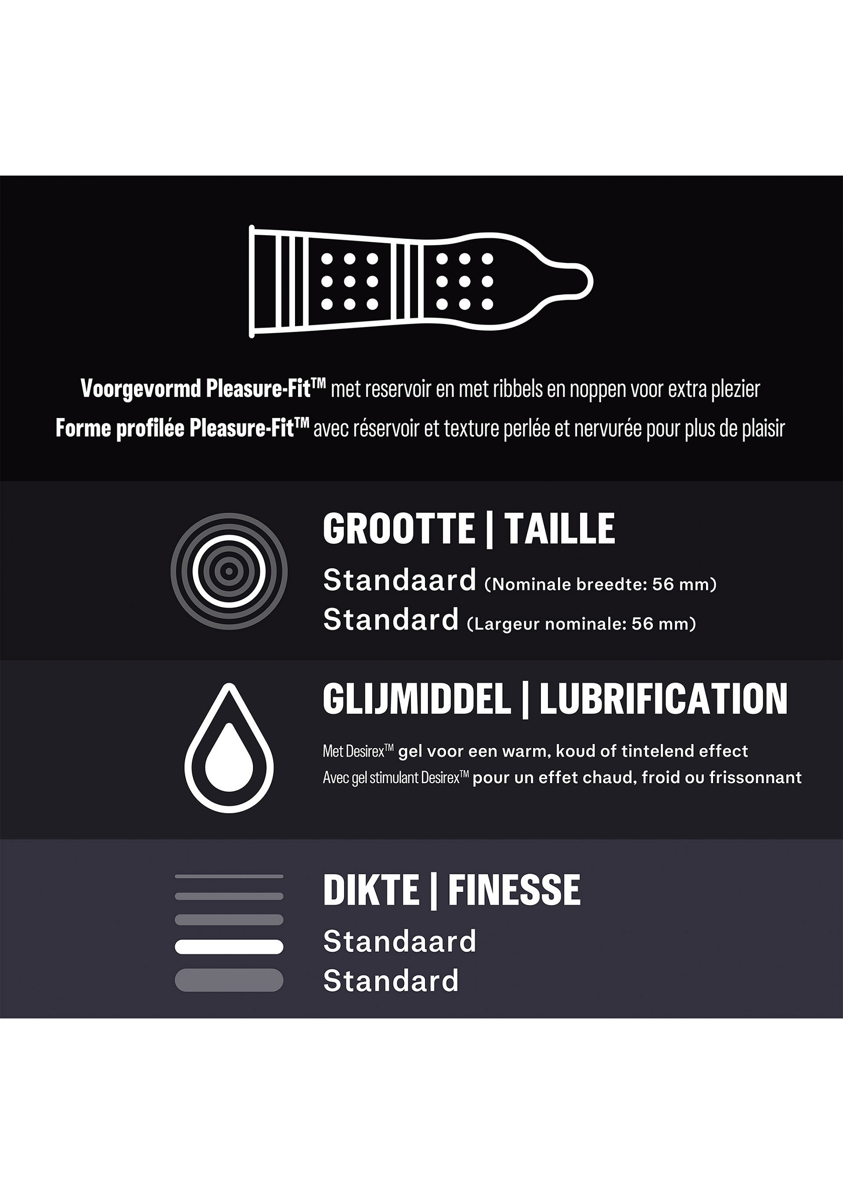 I preservativi Durex Orgasm™ Intense assicurano un orgasmo intenso e stimolante per il partner femminile. I preservativi con Desirex gel stimolante con effetto caldo e avvolgente che ti fa sentire a tuo agio. Preservativi con rilievi e nervature per nuove sensazioni. Realizzato in gomma naturale e trasparente. Circonferenza larghezza nominale 56mm