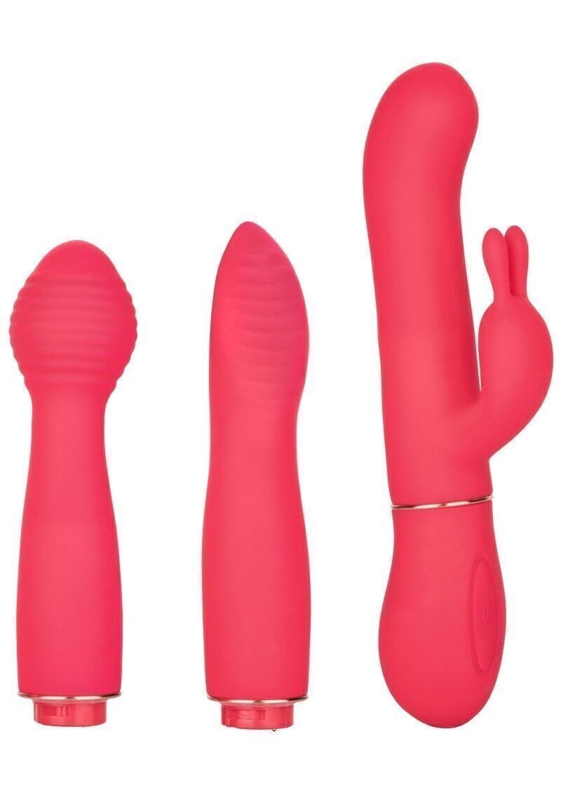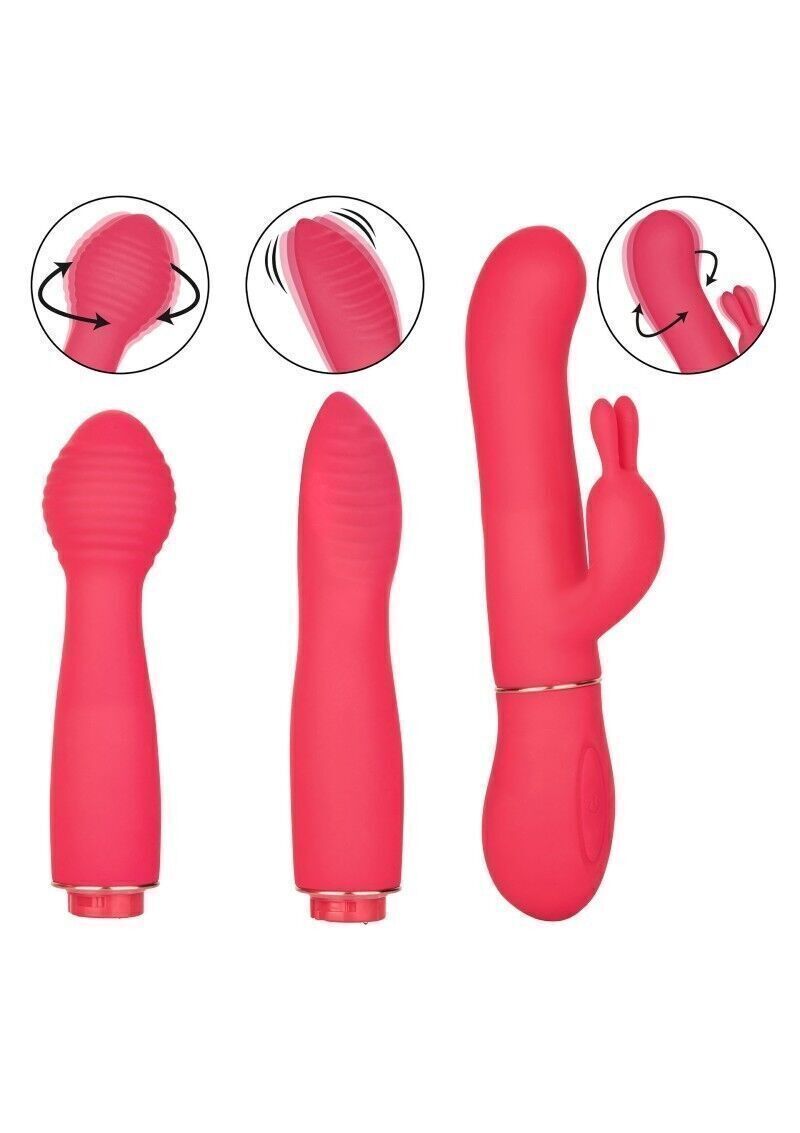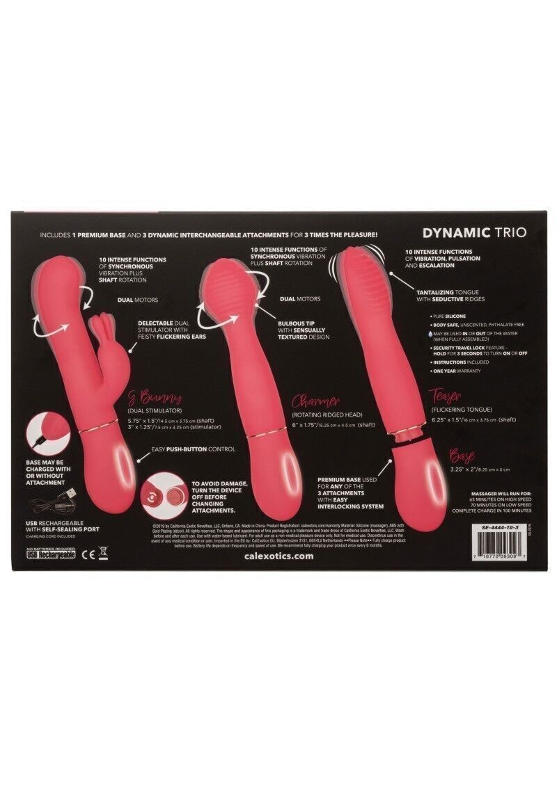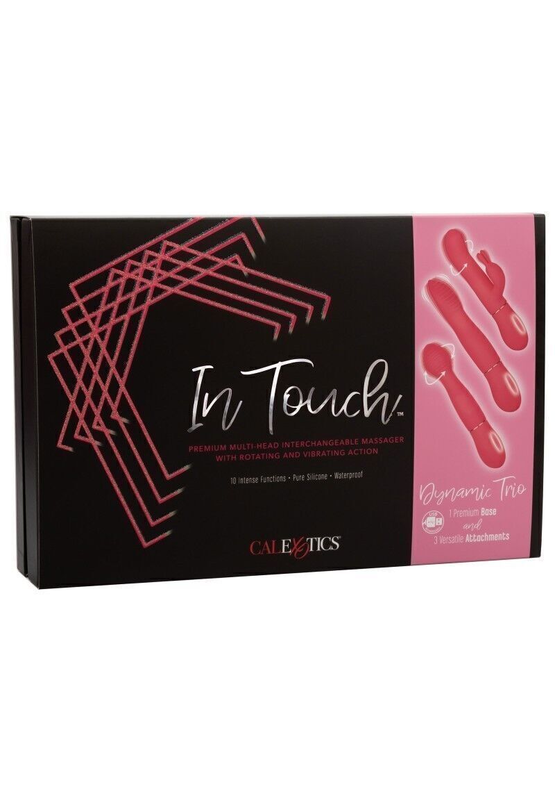 Realizzato per adattarsi ai tuoi piaceri, In Touch™ Dynamic Trio è un set vibratore versatile con 3 accessori dinamici che pulsano al ritmo di 10 funzioni di vibrazione e 3 volte il piacere. Questo vibratore sensuale è perfetto sia per i principianti che per gli esperti erotici con 3 accessori elettrizzanti. Fornisci una stimolazione che scuote le ginocchia con le 10 funzioni di vibrazione del Teaser. Entusiasmante anche il più cattivo con i doppi motori di G Bunny e 10 funzioni di vibrazioni sincronizzate e rotazioni dell’albero. Lanciati in un paese delle meraviglie della passione mentre Charmer offre 10 funzioni di vibrazioni sincronizzate e rotazioni dell’albero. Il pulsante senza soluzione di continuità controlla fino a 70 minuti di piacere vibrante. Ricarica la tua passione in sole 1,5 ore con il cavo USB in dotazione. Il corpo e la base in silicone ultra morbido consentono al massaggiatore setoso di muoversi con il tuo corpo. Le forme lisce dello stimolatore sagomate e la superficie morbida ti consentono di fornire vibrazioni sensuali da qualsiasi angolazione di questa atmosfera sensuale.